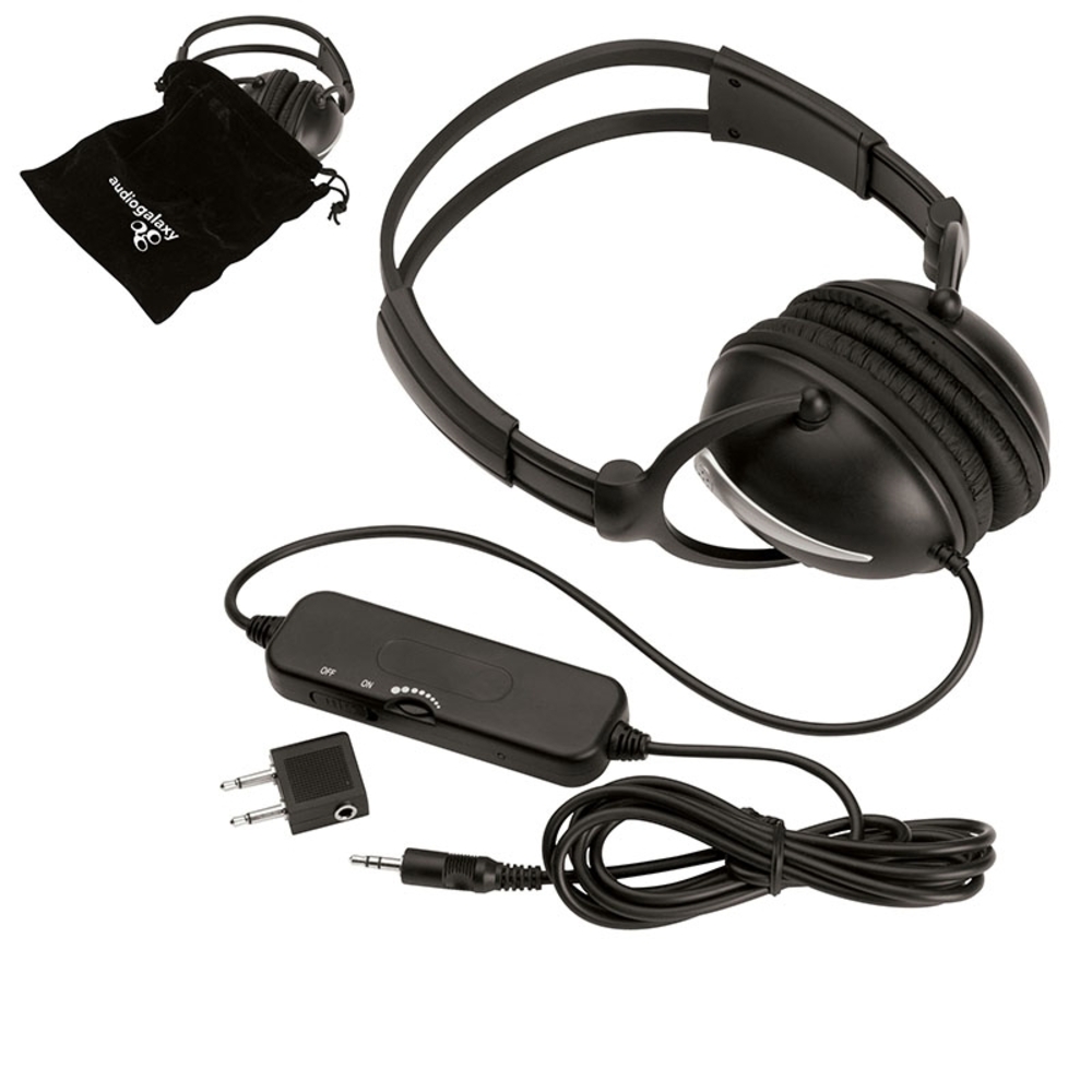 Padded comfort noise cancelling headphones with volume control, airplane plug and carry case. Option: 2 AAA Batteries $0.70 (g)